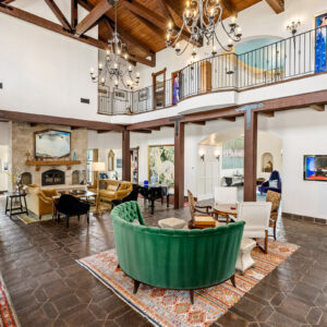 The main residence, crafted in 2017 and complete with an elevator, “offers an exceptional living experience,” says Meredith. Richly detailed inside and out, the expansive retreat has echos of the early California hacienda style with exposed beams, imported Spanish tile and wrought iron throughout. Large windows frame far-reaching views of meadows and hills while welcoming an abundance of natural light.