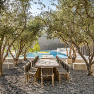 Further defining the interiors are five ensuite bedrooms, including a spectacular primary suite, plus a private home office with a generous terrace, an open kitchen and family room, a catering kitchen, two elevators, and a fabulous entertainment wine cellar lounge with a separate family room retreat. There are an additional three bedrooms for staff quarters. The “La Vue” estate is fully technologically automatized with a top-of-the-line Crestron System, and is offered fully furnished and curated by internationally acclaimed designers.