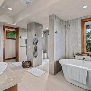 Luxurious side-by-side showers and an extra deep soaking tub might seem like the only elements needed to create a relaxing bath retreat in most destinations. But when you’re in a dream vacation locale like Hawaii, the term ‘sanctuary’ takes on new meaning. This Polynesian-inspired oceanfront paradise, nestled on 8.5 sprawling acres in Maui’s Launiupoko neighborhood, brings these two luxury bath must-haves and seemingly connects them to nature. Wall-to-wall natural stone, a calming neutral color palette, and—perhaps, the ultimate indulgence—a view of lush tropical greenery (with Kaho’olawe, Lana’i, and Moloka’i islands in the backdrop), give the entire primary bath space a calming quality. What more could one want in the ultimate Hawaiian escape?