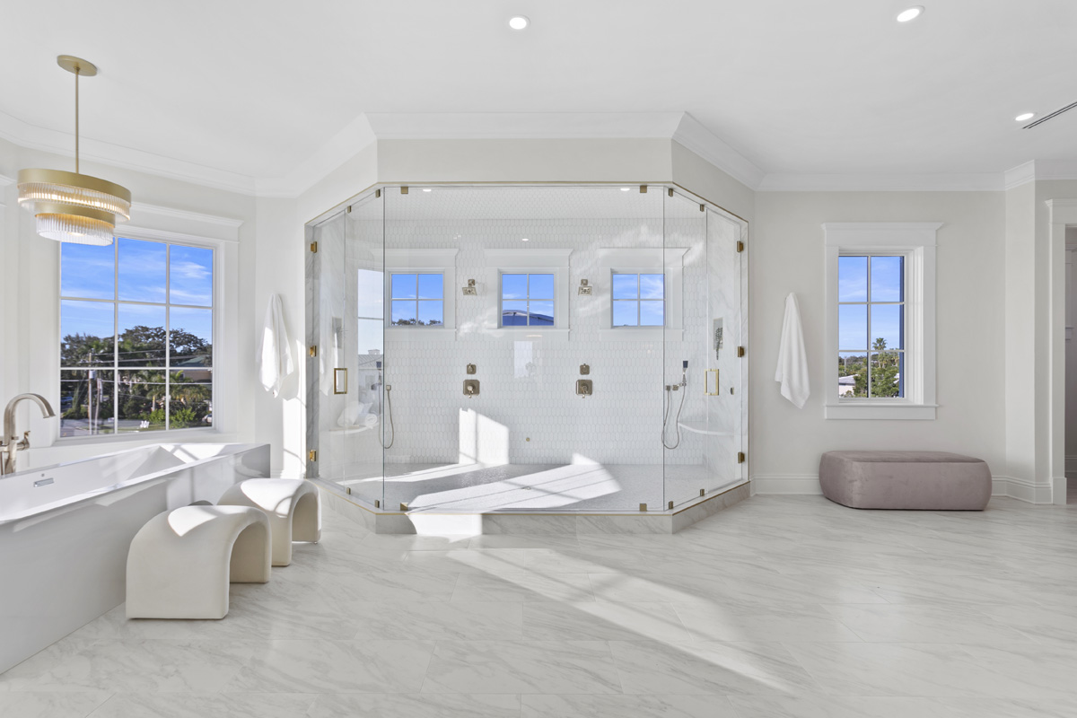 This modern coastal gated estate in Tampa Bay takes the “space is the new luxury” concept to its logical conclusion in the spa-inspired primary bath. A prominent soaking tub takes full advantage of the home’s mesmerizing 110 feet of prime bay frontage, offering a front-row seat to tranquil water views. Meanwhile, a voluminous full glass shower with dual showerheads and steam introduces a wellness element into the already serene space. Two separate water closets and an adjoining cappuccino bar and beverage center help take it to five-star.