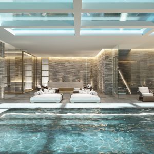 The home’s lower levels feature an atrium bar and lounge, a media room, game room, wine room, and wine cellar, plus a glass-bottom reflecting pool that illuminates an indoor waterfall swimming pool and spa one level down. There is also a maid’s suite with a kitchenette, a wet bar, a gym, and a four-car garage with a car lift serving the automotive museum below.