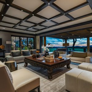 Art-gallery walls, meticulously finished woodwork and seamless indoor-outdoor flow provide a stunning backdrop. One wall of the grand living room, with coffered ceiling, fireplace and wet bar, opens fully an outdoor living room. The formal dining room, with its vaulted herringbone-brick ceiling and walk-in wine display, is suitable for the most gracious gatherings, while the kitchen is equipped with every quality appointment for the preparation of both casual and large-scale meals.