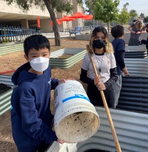 On Jan. 28, Chen and his troop cleared and leveled the school’s new garden site and constructed and placed the planter boxes. The irrigation trenching was completed by Feb. 5. On Friday, Feb. 17, the topsoil/compost mixture was delivered, shovels and wheelbarrows were at the ready, and more than 50 sixth, seventh, and eighth-grade students and students from Troop 506 arrived to connect irrigation lines and fill the planter boxes with the topsoil. By 2 p.m. the job was done.